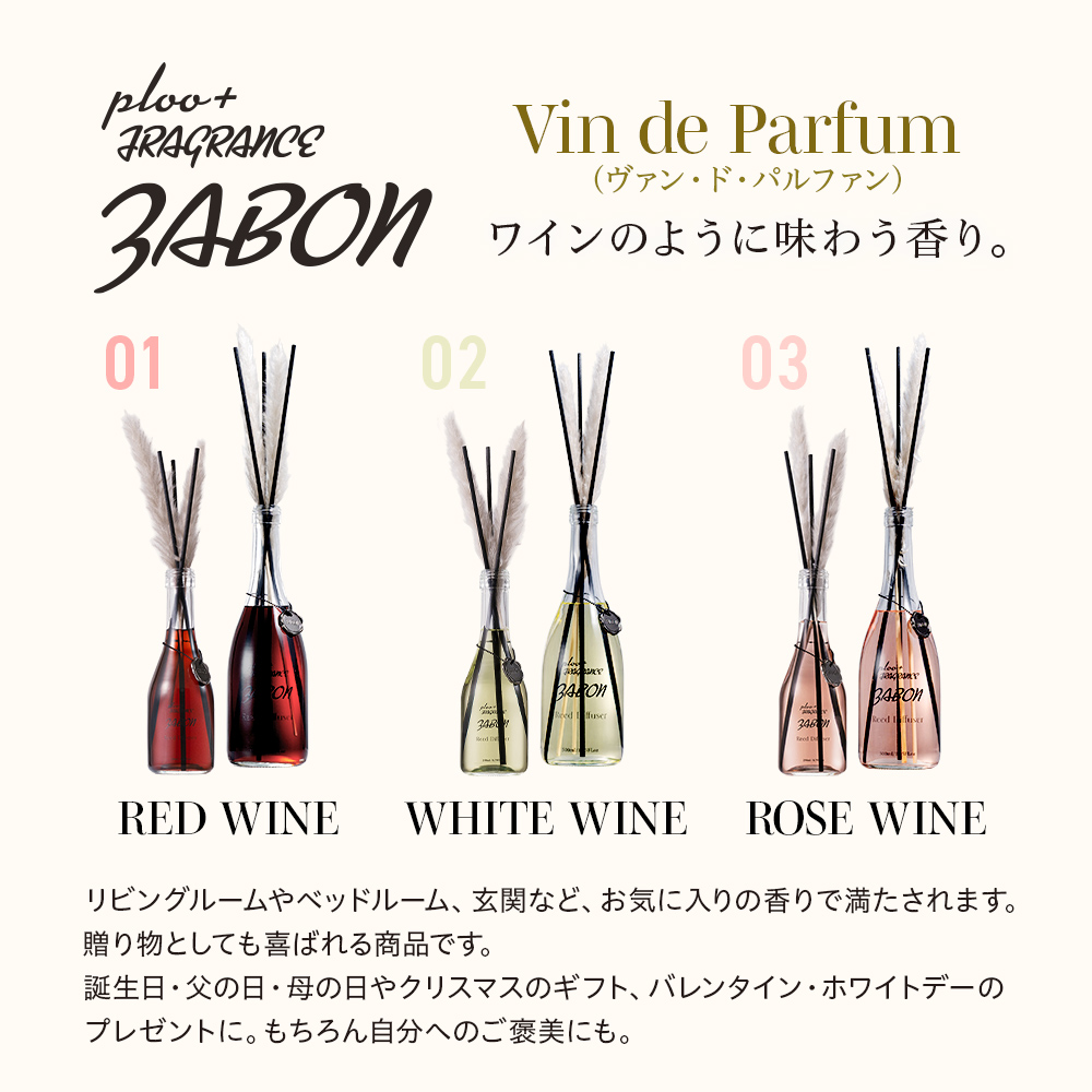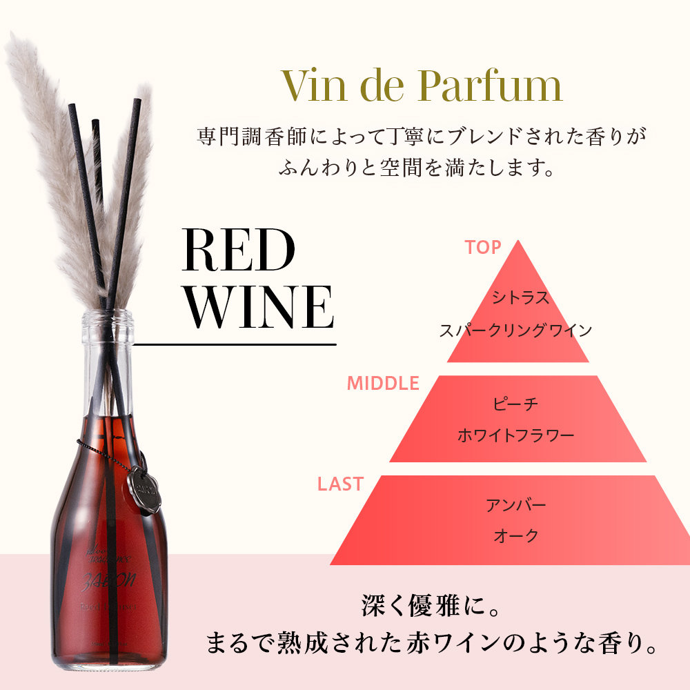 赤・白・ロゼの3つの香りがまるで熟成されたヴィンテージワインのように空間に静かに広がります。それぞれの香りは繊細に重ねられたノートが時間とともに開花します。ワインをゆっくり味わうように空気に香りを注ぐ体験を。リビングルーム、ベッドルーム、バスルームやトイレなど部屋中がお気に入りの香りで満たされます。
