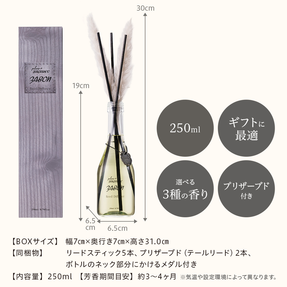 容器、香りオイル、スティックの3点がセットになった『ZABON リードディフューザー ルームフレグランス250ml』リビングルームやベッドルーム、玄関など、お気に入りの香りで満たされます。贈り物としても喜ばれる商品です。誕生日・父の日・母の日やクリスマスのギフト、バレンタイン・ホワイトデーのプレゼントに。もちろん自分へのご褒美にも。