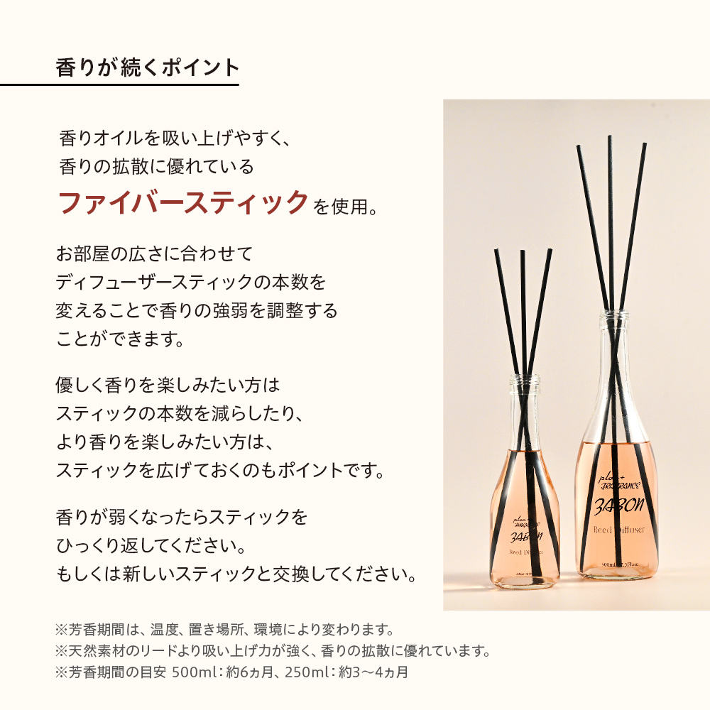 | 芳香期間 | 香りは約3~4ヶ月お楽しみいただけます。(度や環境、エアコンなどの風が直接当たるところでは極端に使用期間が短くなることがあります。)お部屋の広さに合わせてディフューザースティックの本数を変えることで香りの強弱を調整することができます。優しく香りを楽しみたい方はスティックの本数を減らしてください。 |