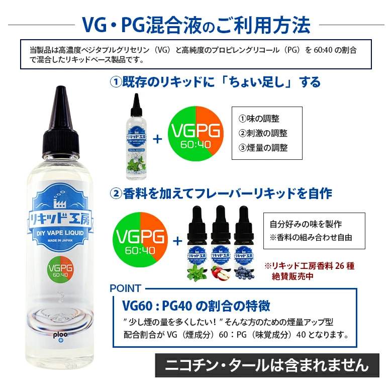 | 成分 | 食品用グリセロール純度99.7%・食品用プロピレングリコール99% |