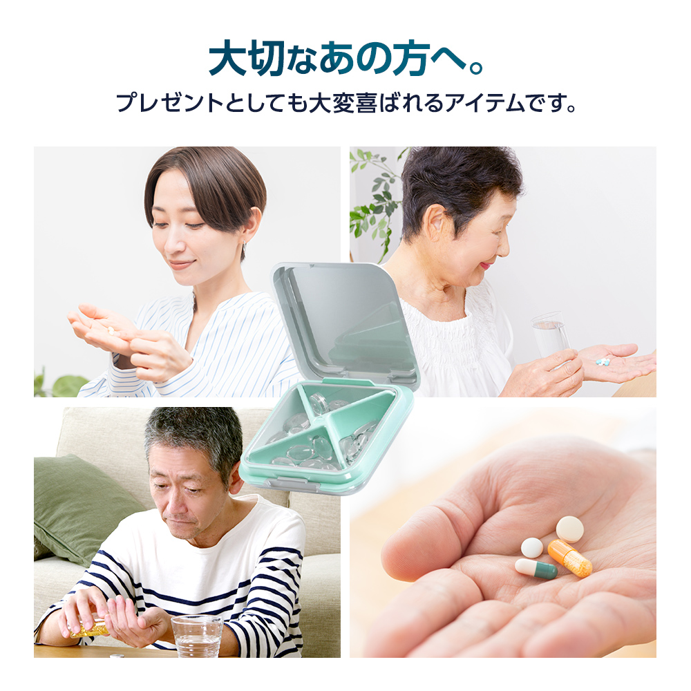 ちょっとしたプレゼントにも最適なピルケース。自分用、親のお薬入れ、パートナーのサプリメントケースなど、家族色違いでお使いいただけます。