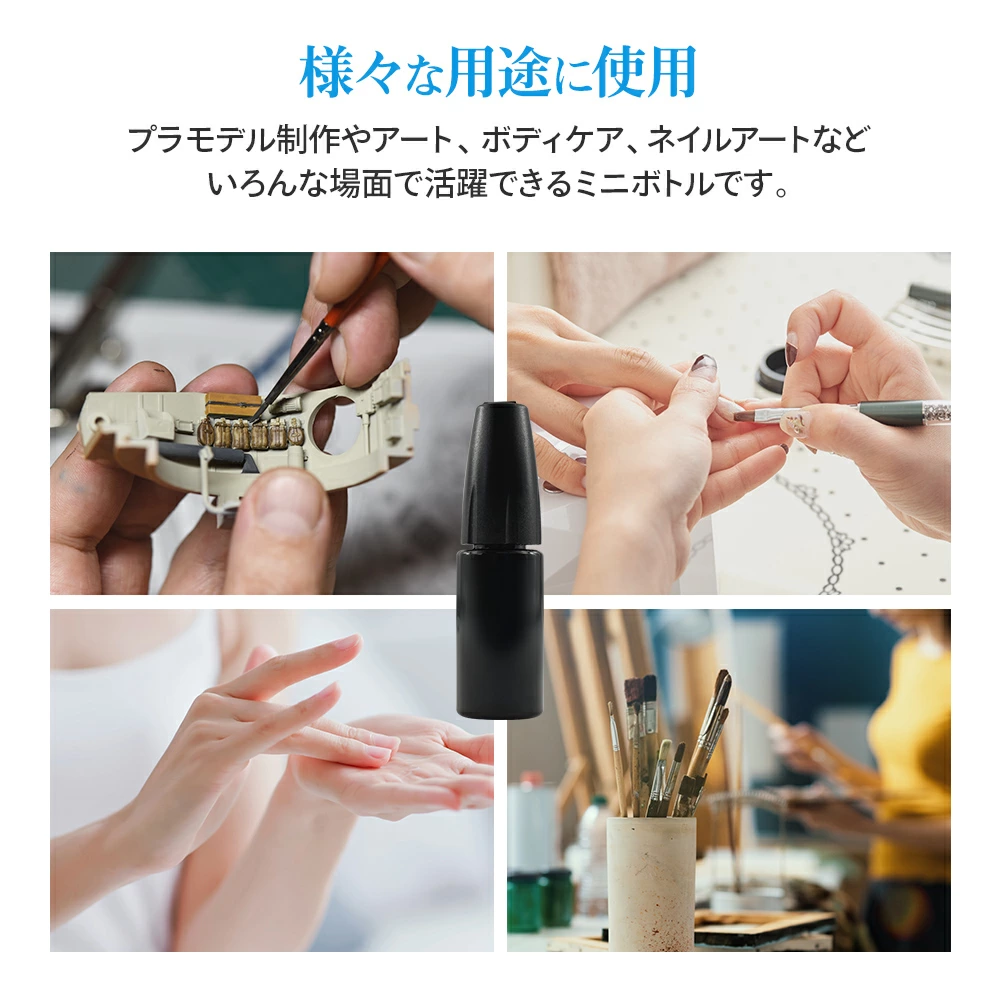 プラモデル制作や、アート、ボディケア、ネイルアートなどいろんな場面で活躍できるミニボトルです。