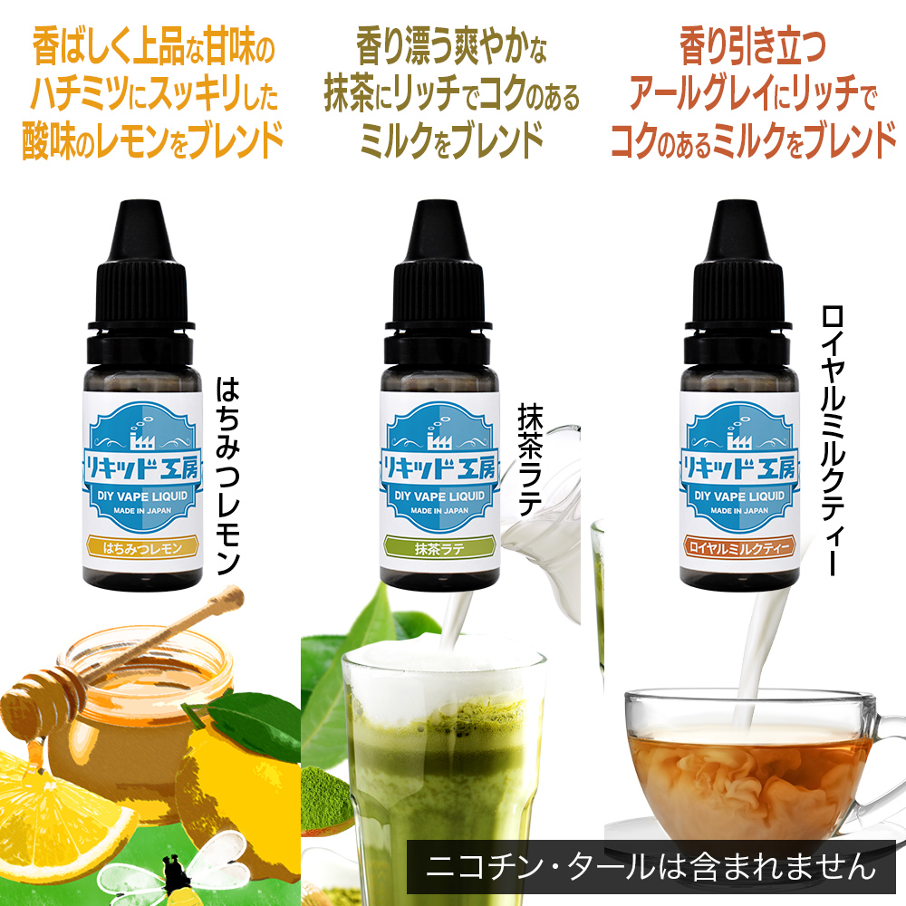 お客様のご要望により国産リキッドメーカーとして素材の品質を落とすことなく味、香りにこだわったリキッドの開発に成功しました。そのままでも十分にお楽しみ頂けますし他のリキッド工房シリーズと混合して自分好みの味に仕上げることも出来ます。安心安全な日本国産 弊社のリキッドは全て日本国内の衛生管理の行き届いた工場で製造しております。ニコチン・タールは含まれません。