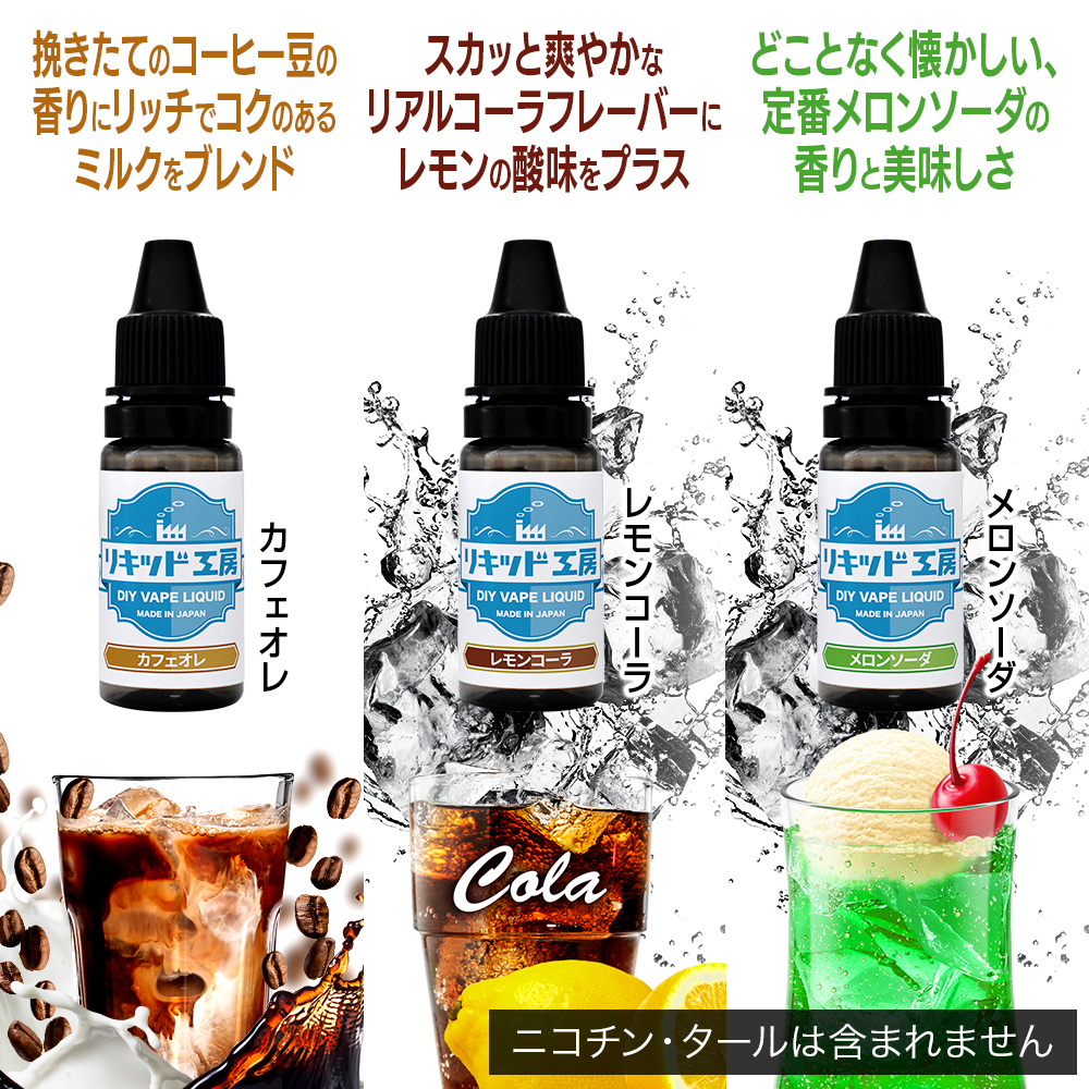 | 成分 | 食品用グリセロール・食品用プロピレングリコール・天然日本ハッカ(レモンコーラのみ)・食品用香料・コーヒーエキス(カフェオレのみ) |
