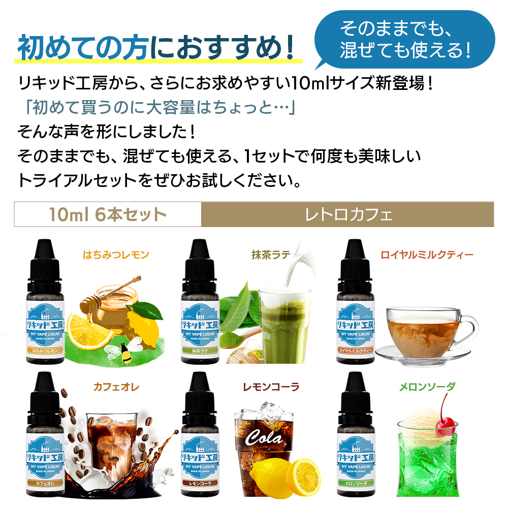 | セット内容 | リキッド工房 人気フレーバー 10ml×6本(はちみつレモン、抹茶ラテ、ロイヤルミルクティー、カフェオレ、レモンコーラ、メロンソーダ) |