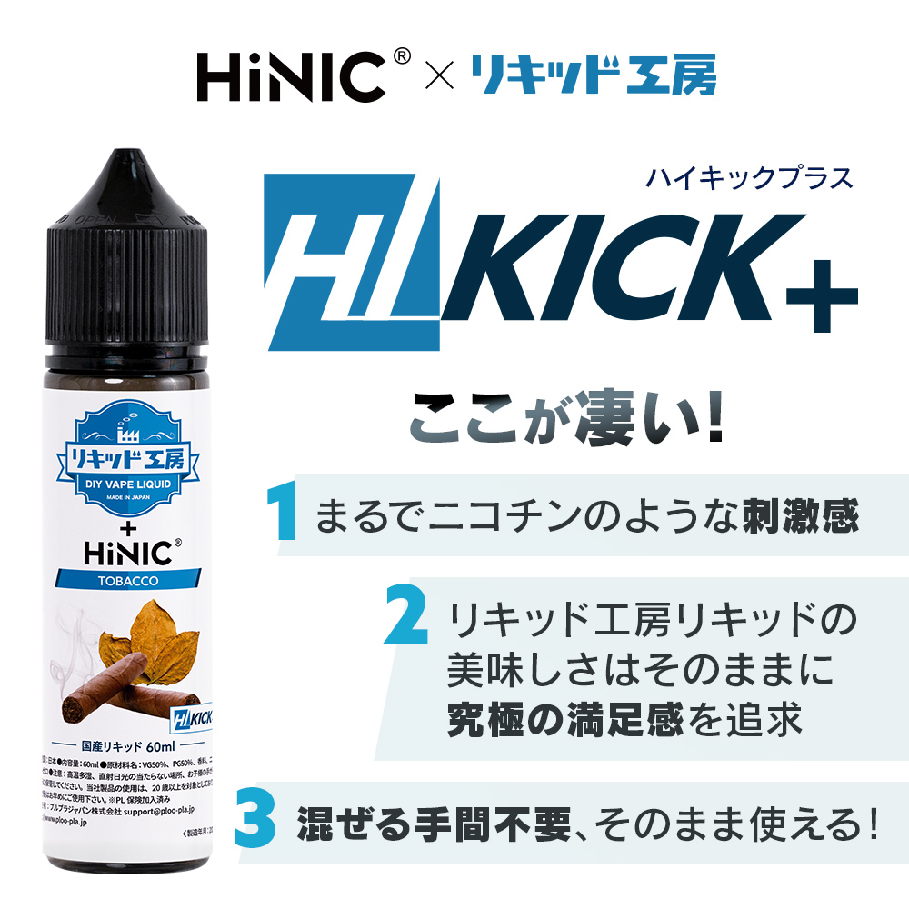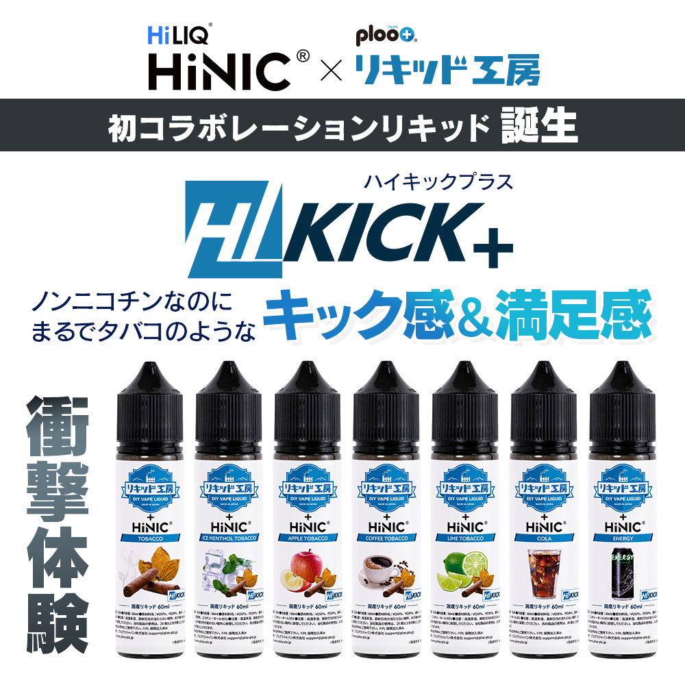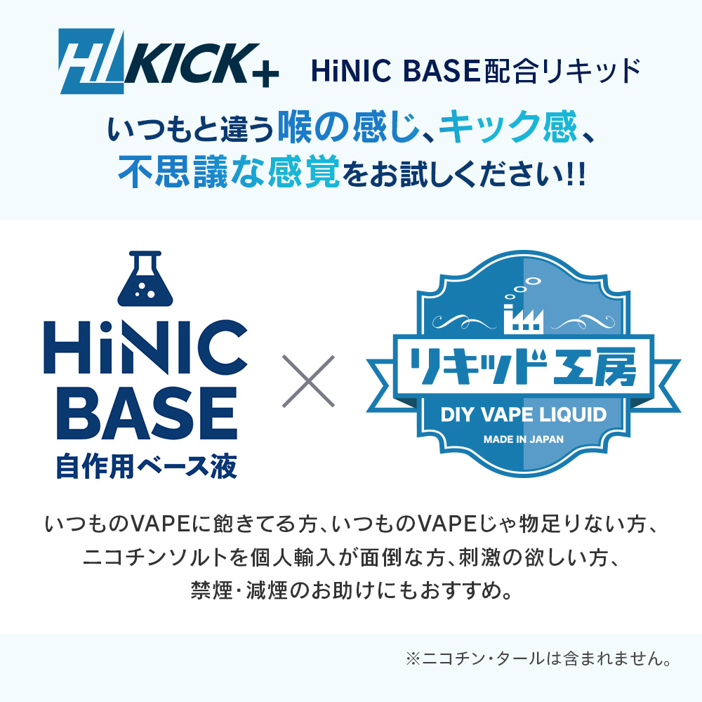 従来のニコチンフリーリキッドでは、刺激感が得られませんでした。しかしHiNICベース液配合のこのHIKICK+リキッドは、ニコチン特有の喉越しの感覚や、舌の上でのスッキリとした爽快感を体験できます。