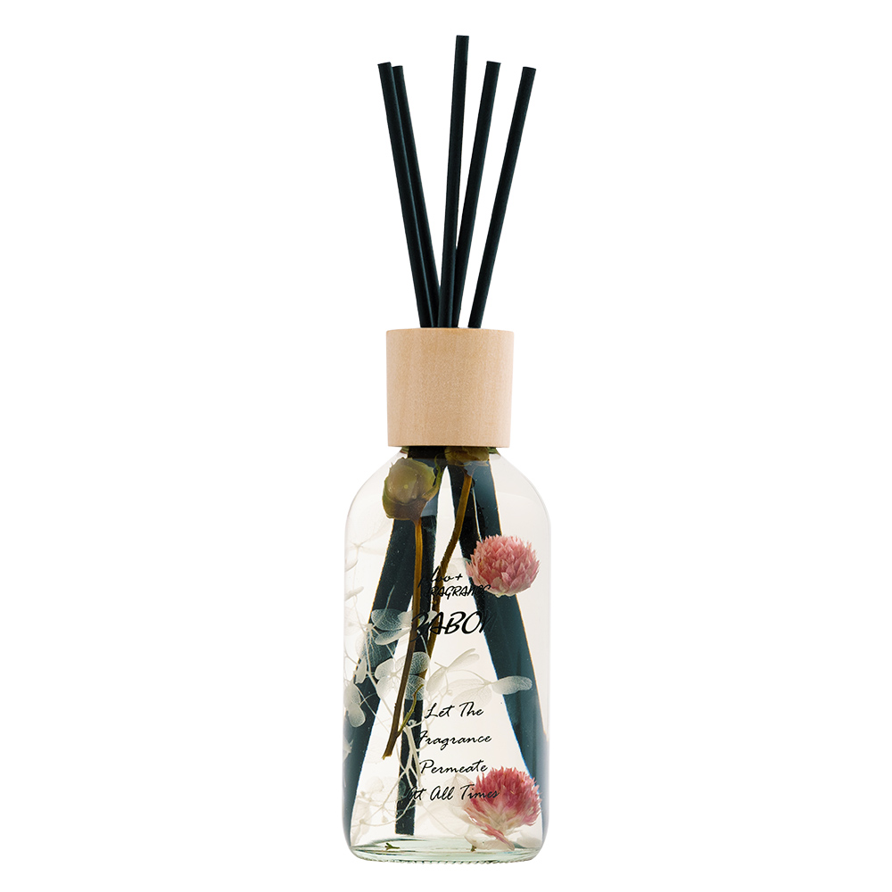 ドライフラワーを香りのオイルに漬け込み香りも見た目も楽しめ、インテリアを彩る1台2役の高級感あふれるルームフレグランスです。※天然の花や植物を使用しているため、熱や紫外線、時間の経過等により、香りオイルやドライフラワーが変色したり、濁りや沈殿物が生じる場合がございます。香りは、お好みや気分に合わせて「ホワイトムスク」「オーシャンブリーズ」「パフュームブルー」「ブラックアンバー」「スイートエアー」「フローラルドリーム」の6種類のルームフレグランスからお選びいただけます。最初の香りを楽しんだあとは、『ZABON ディフューザーリフィル(詰め替え 別売)』の中からその時々の気分に合った香りを選んで繰り返しお楽しみください。ガラス瓶は、洗浄して繰り返しお使いいただけるよう、香り名を印字しないシンプルなデザインに仕上げました。