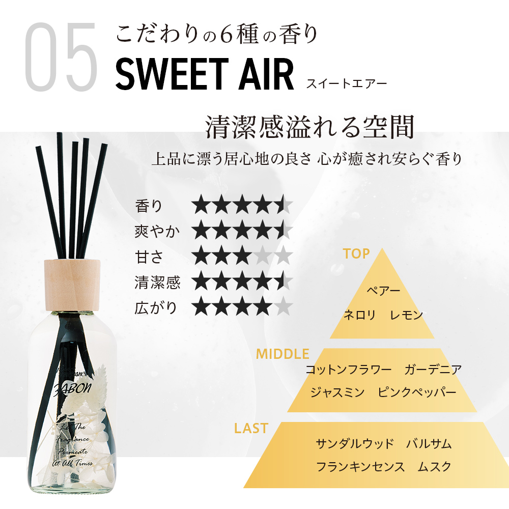ドライフラワーを香りのオイルに漬け込み香りも見た目も楽しめ、インテリアを彩る1台2役の高級感あふれるルームフレグランスです。※天然の花や植物を使用しているため、熱や紫外線、時間の経過等により、香りオイルやドライフラワーが変色したり、濁りや沈殿物が生じる場合がございます。香りは、お好みや気分に合わせて「ホワイトムスク」「オーシャンブリーズ」「パフュームブルー」「ブラックアンバー」「スイートエアー」「フローラルドリーム」の6種類のルームフレグランスからお選びいただけます。最初の香りを楽しんだあとは、『ZABON ディフューザーリフィル(詰め替え 別売)』の中からその時々の気分に合った香りを選んで繰り返しお楽しみください。ガラス瓶は、洗浄して繰り返しお使いいただけるよう、香り名を印字しないシンプルなデザインに仕上げました。