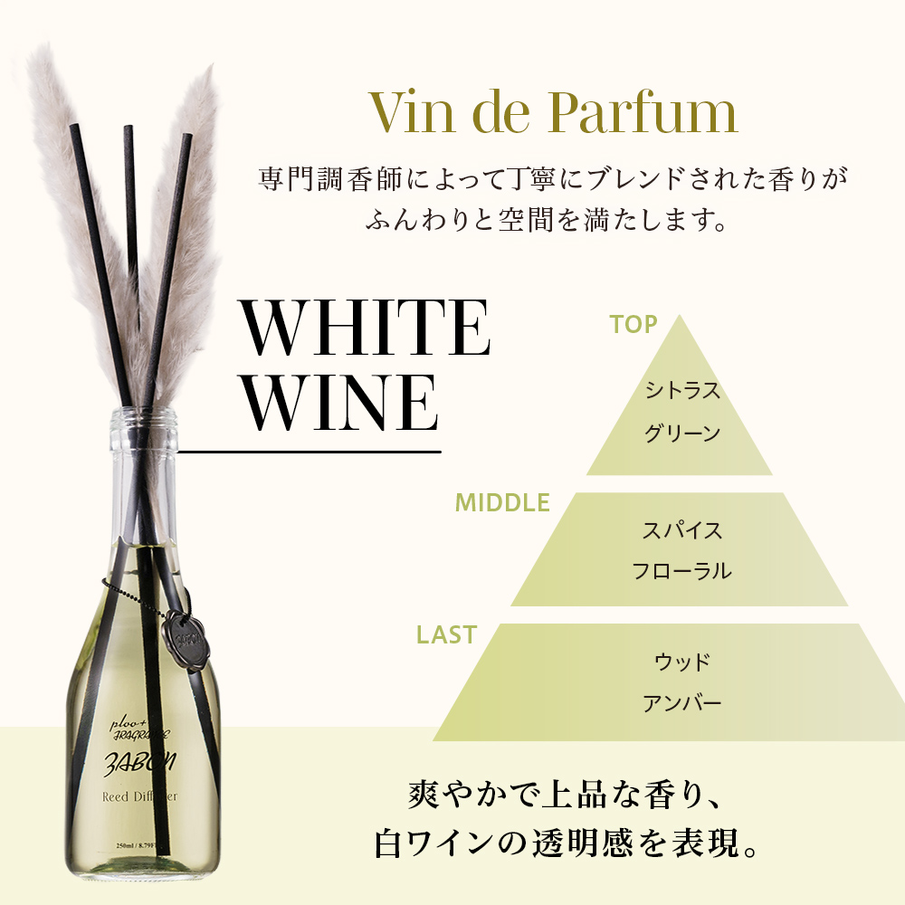 赤・白・ロゼの3つの香りがまるで熟成されたヴィンテージワインのように空間に静かに広がります。それぞれの香りは繊細に重ねられたノートが時間とともに開花します。ワインをゆっくり味わうように空気に香りを注ぐ体験を。リビングルーム、ベッドルーム、バスルームやトイレなど部屋中がお気に入りの香りで満たされます。